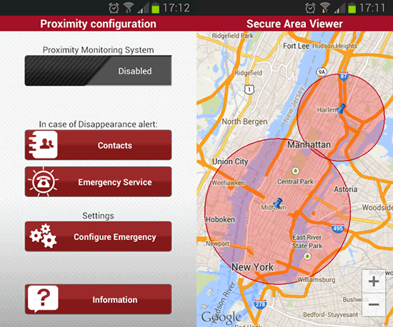 - Proximity protection. The proximity monitoring system allows setting up alerts to be triggered in case of disappearance. Just as with the accident setting, you can set up a list of contacts to be contacted when the alert is triggered or the emergency system. You also have some settings you can change to add for instance the geographical points and see them located on the map. These points should be set depending on the route your kid does daily for example. For each of those points there’s an allowed proximity radius, and if the subject gets out of that area the alert will be triggered. You can also configure the days and hours when these proximity settings should be applied.