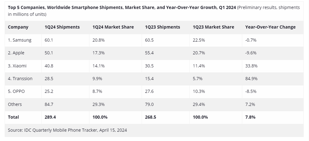 South Korean company Samsung, which launched its latest range of flagship smartphones (Galaxy S24 series) at the start of the year, shipped more than 60 million smartphones in the first three months of 2024.